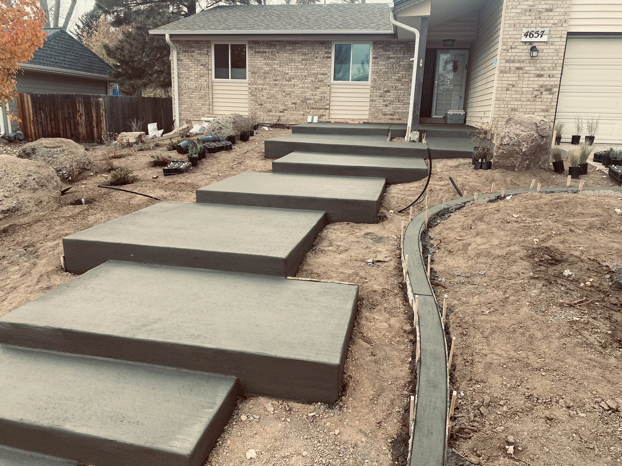 The photo illustrates concrete forms & curb edging. This unfinished landscape will eventually compliment a midcentury front entry.